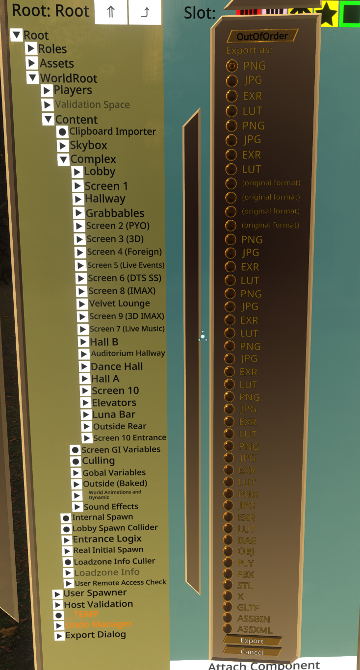 I'm grabbing the top slot of a room and exporting it that way. It's worked successfully for one single room, all the rest either give me insane dialogues like this, or they start to export and fail silently. -